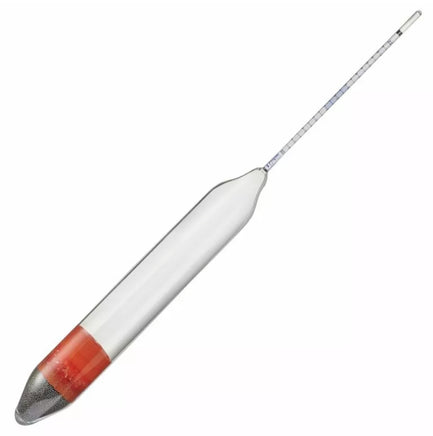 The hydrometer is handmade and designed to float vertically in the water. The maximum deviation is about 0.001 at 77° F (25° C).