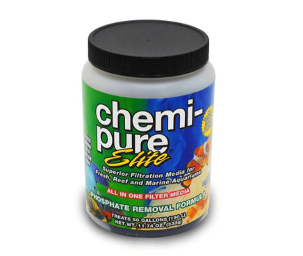 Enjoy superior water quality for a healthier aquarium inhabitants. Works equally well in marine or freshwater aquariums to remove heavy metals, copper, phenol, ammonia, and other nitrogenous waste. Helps keep pH at a consistently safe range and your water sparkling clear. Fantastic for use with African Cichlids and Discus. Chemi-Pure Elite adds ferric oxide to the original Chemi-Pure formula to also remove phosphates and silicates, making it the only complete choice for filtering any kind of aquarium. Each pre-bagged 6.5 oz Chemi-Pure Elite treats up to 20 gallons; 11.74 oz Chemi-Pure Elite unit treats up to 50 gallons. Each extra-large 46.96 Grande Elite nylon bag treats 175-200 gallons. Remains active 4-6 months.