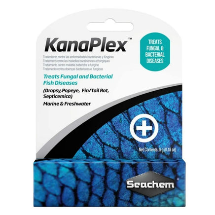 KanaPlexTM is a blended kanamycin based medication that safely and effectively treats several fungal, and bacterial fish diseases (dropsy, popeye, fin/tail rot, septicemica). Because it is absorbed by fish it is useful in treating internal infections in those situations where food is refused. It does not adversely affect the filter bed and is easily removed with carbon. Usual dose is 360 mg/40 L (10?gallons). Contains kanamycin sulfate, potassium sulfate